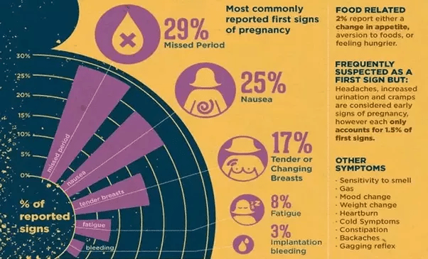 The other typical early pregnancy signs and symptoms are nausea tiredness and missing a menstrual period.
